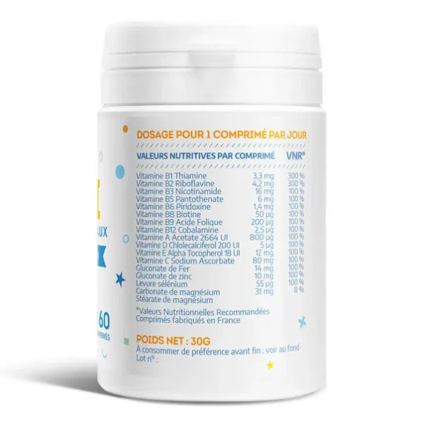 ■ Chaque comprimé comprend des nutriments de qualité : Vitamines B1, B2, B3, B5, B6, B8, B9, B12, A, D, E, C, Fer, Zinc, Levure sélénium.